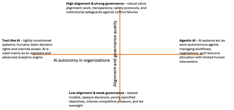 At the west end of the horizontal axis, is “Tool-like AI”; and the east end of the AI is “Agentic AI”. The tool-like AI context is characterized by the prevalence of tightly controlled systems, where humans retain decision rights, and override power; and AI is mainly used as an assistant and advanced analytical engine. In the agentic AI context, AI systems act as semi-autonomous agents managing workflows, negotiations, and resource allocations with limited human intervention.