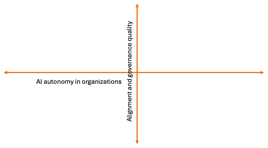 The two primary axes of uncertainty are “AI autonomy in organizations” and “alignment and governance quality”. I map the AI autonomy on the horizontal axis and the alignment and governance on the vertical axis.